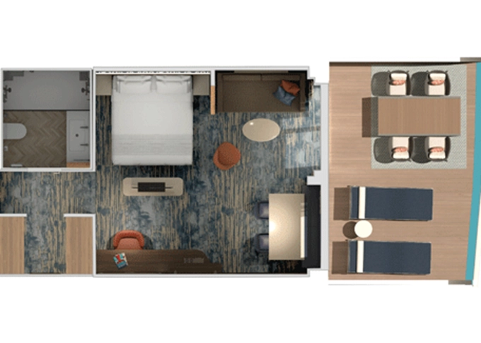 HU - Suite Havana Cabana Corner 33 m² + vonkajšie rohové patio 15 m². 8. paluba vpredu. Max 3 osoby. Tropický štýl, vstup do exkluzívnej zóny Havana. Výhody Suite. 5 280 € 2 640 € za osobu