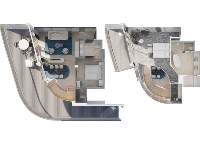 | VKKO - Kajuta s terasou 20 m² + balkón 13 m² so stoličkami a váľandou. 15. paluba. Max 2 osoby. | 6 898 € 3 449 € za osobu | ||